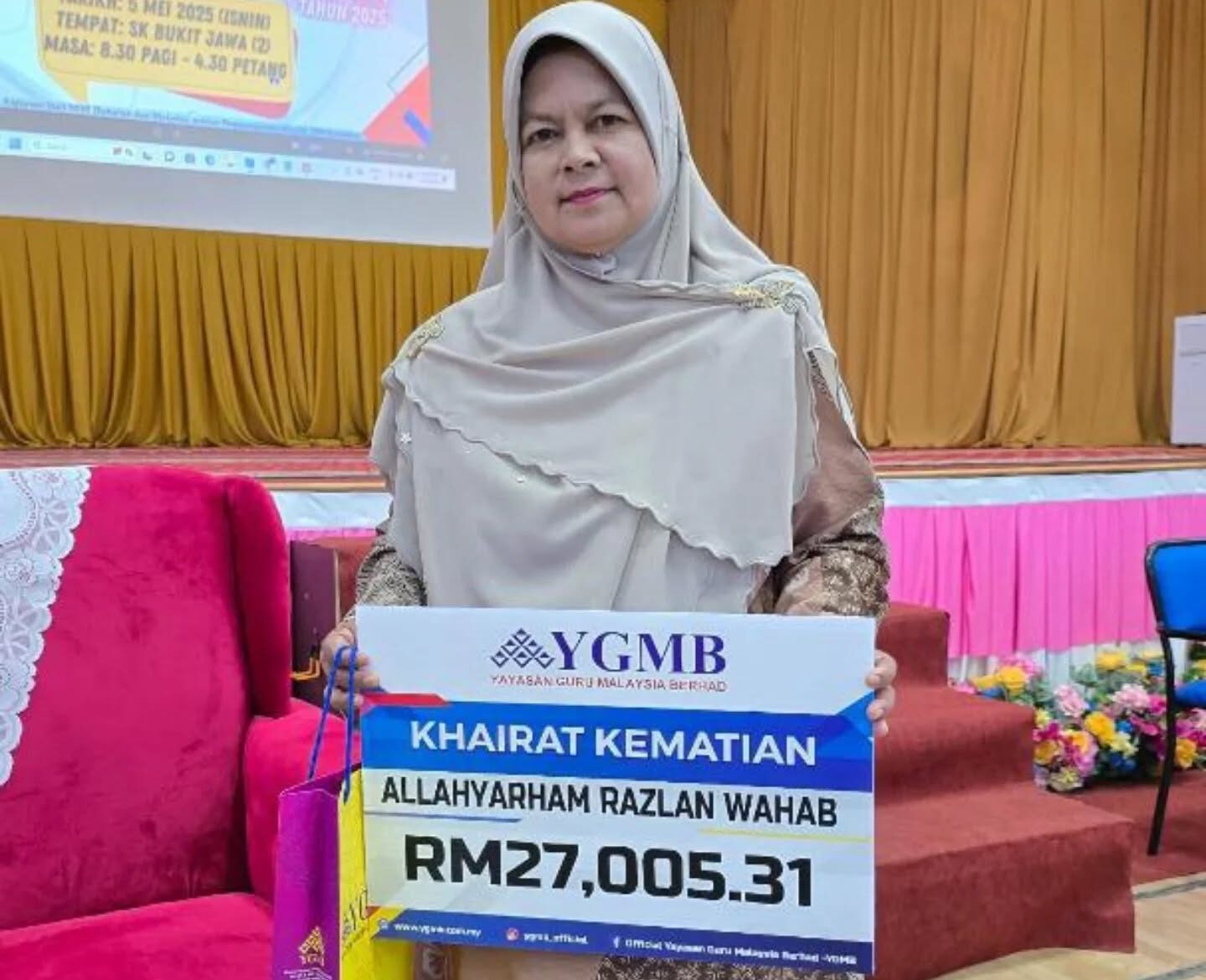 Ahli Lembaga Pemegang Amanah YGMB, Drs. Ahmad Yani Muhammad (tengah) menyampaikan manfaat Khairat Kematian bernilai RM27,005.31 kepada waris Allahyarham Razlan Wahab, Zahrohaizan Che Yusof (dua dari kanan) dalam Program Pengurusan Guru Penasihat Badan Pengawas dan Kelab Pencegahan Jenayah Peringkat Negeri Kelantan di SK Bukit Jawa 2, Kota Bharu baru-baru ini.